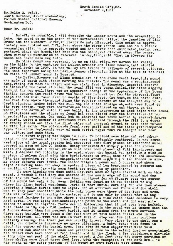 In 1921, at the age of 25, he was walking from his home in Gladstone to Parkville. At that time the only road from there to Parkville, happened to go through what would become the Renner-Brenner Park. Back then, it was only a freshly plowed field for the first or maybe the second time. His unique eye saw the abundance of material turned up by the recent plowing and sought permission to make a map of what he saw. At that same time Vivion Road was under construction and it plowed right through the heart of the sitel