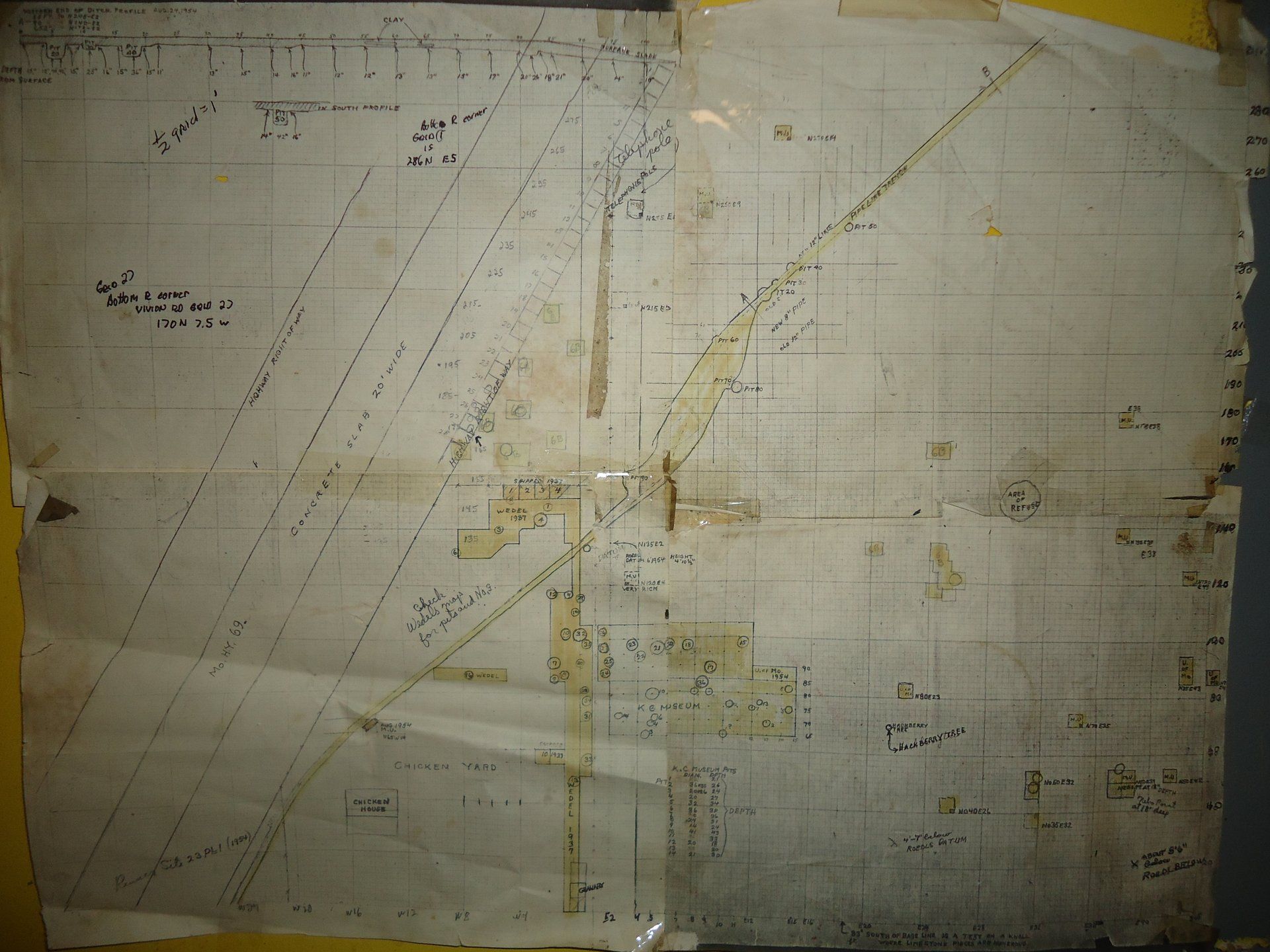 This is a copy of a map Shippee created in 1954. He allowed me to copy it. I later drew some notes on it. It's significant in that it's the only report I know of, of his work in the earlier 1930's regarding the pipeline. The top left notes are the profile he made of the pipeline ditch. There are other notes he made on this same map before any excavations where he noted: large concentrations of rock, area of refuse and more. It also shows excavations made by other's not reported in any other place or map.